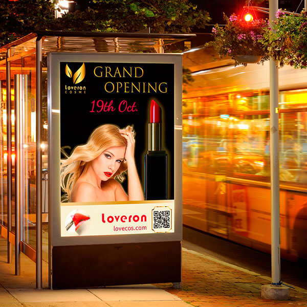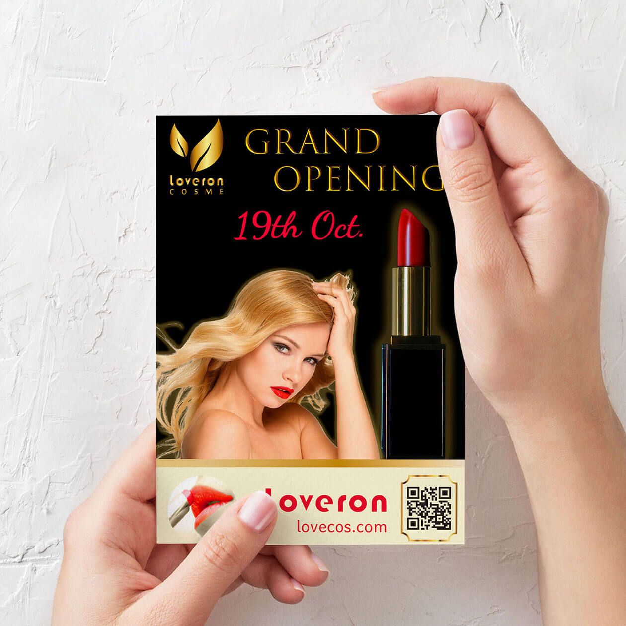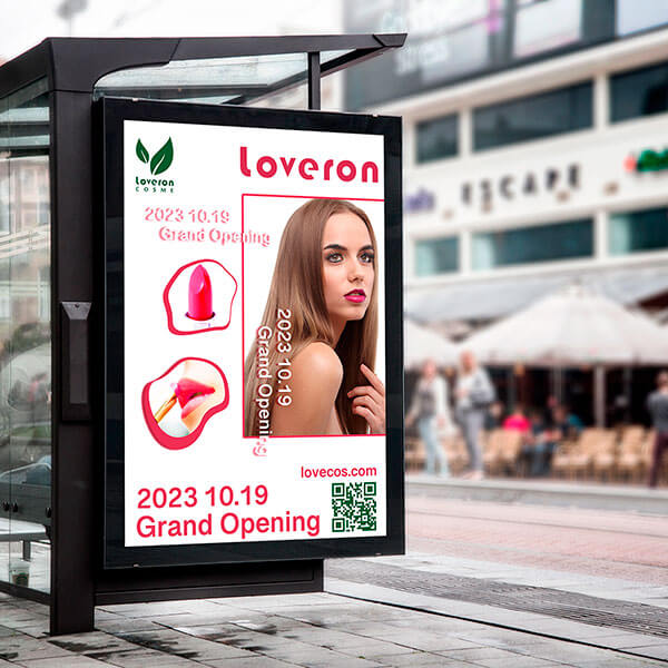 架空のコスメブランド「Loveron」の店舗リニューアルオープン告知DMとポスターデザイン①です。